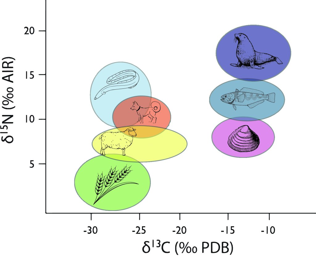 Carbon and Nitrogen: Carbon and nitrogen go together like lamb and mint sauce. Together they can tell us about both the plants and the animals that people were eating. Carbon isotopes mostly come from the plants you eat, and different types of plants have different carbon isotope ratios. Nitrogen mostly tells us about how much meat is in your diet, the higher your nitrogen isotope ratio, the more meat you’re eating. Oh, and if you’re eating seafood both your carbon and nitrogen isotope ratios change in known ways. So they tell us if you’re using the land, the sea, or a mixture of both to keep yourself fed.