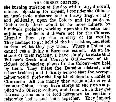 One of the questions our Southern Cemeteries bioarchaeology project is trying to answer is whether there is archaeological evidence of anti-Chinese prejudice and marginalisation of Chinese communities on the goldfields. We have so far found the graves of some of the earliest Chinese to come to Gabriels Gully in the Ardrossan Street cemetery (which was closed in 1866), and also evidence of the exhumations of Chinese burials in the Chinese section of the Gabriel Street cemetery in Lawrence.
