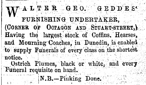 The Victorians loved decoration and pomp, and had a fascination with death. Death rates, especially amongst women and children were still very high, and Queen Victoria’s lifelong mourning for her husband Prince Albert after his death in December 1861 placed mourning traditions firmly in the public imagination. The ‘Beautification of Death’ movement was a fashion that saw not just the coffins becoming very ornate, but also the adoption of other funeral practices such as the black hearses pulled by black horses wearing plumes, black dressed pall bearers, and long funeral processions. For the very wealthy large headstones or even masonry tombs were also built: William Larnach’s tomb in Dunedin’s Northern Cemetery is one of the grandest in Otago.