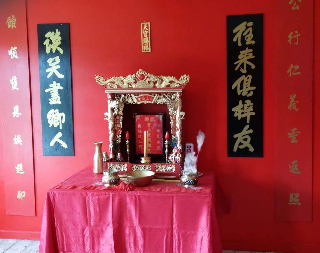Yon said, “You put the fruit in the bowl on the altar and burn the incense in the pot. The panels at the altar remind us that ‘We are the same creed; Happiness and good fortune come to friends’. Kneel for a moment to honour our ancestral spirits, and bow with the palms of your hands together.”