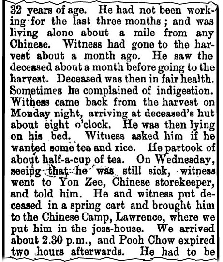 He said, “A young man died here about one month ago, he didn’t belong in this camp and was brought in by cart – a very sick man. He is buried beyond the trees where only Chinese are buried.” “When I viewed his hut there was little except the bowl he ate from. I punched a hole in the bottom of it to release the ‘spirit’ so nobody else could use it. Pieces of wood and metal were given away to the other miners and the clothing was burnt. Chinese would not occupy a hut after the owner has died.”