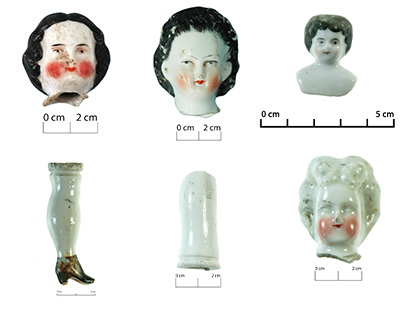 Unlike miniature tea wares, the remnants of dolls found in Christchurch are, arguably, not so adorable. Some might go as far as to say they’re downright terrifying (I love them, but I have learned the hard way that not everyone does…). We mostly find bits of dolls, rather than whole dolls – detached ceramic legs and arms, tiny porcelain hands and broken heads. This is because many of the dolls of the nineteenth century would have had a stuffed cloth body onto which the arms, legs and head were attached with thread. You can see the evidence of this, on those occasions that we find a whole leg, in the little groove around the calf, where the thread or string would have been placed, to attach the limb to the body. Those bodies either don’t survive, or the limbs and heads that we find are those that fell off the body – a snapped or fraying thread, perhaps – and were lost.