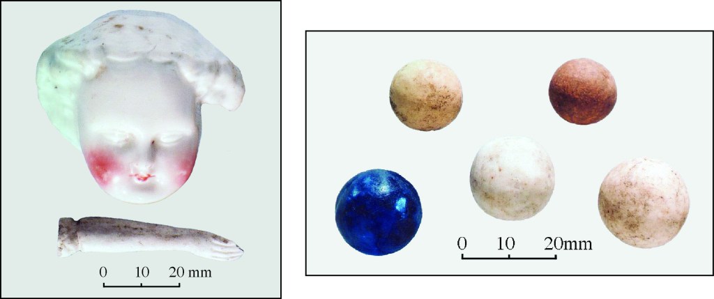 We don’t have any toys in our cemetery samples, colonial christian cultural practices generally mean that burials don’t include any personal items. However, our site director Peter has found toys elsewhere in his Otago colonial excavations, and his evidence for child’s play is pretty similar to what Jessie is seeing in Christchurch. In the St. Peter’s Vicarage in Queenstown, for example, Peter found a lot of evidence for the presence of children. Here, just as in Christchurch, miniature teasets, doll parts and marbles are the most obvious examples of child’s play.