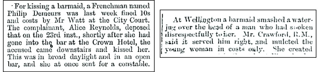Some of these women even became business owners, running local institutions like the Masonic Hotel in Lawrence. Usually these business owners were ‘respectable’ women, widowed and taking over their husband’s business, or with husbands who shared in the running of them. These women were business-savvy and unafraid to protect their own interests. In her excellent book “A History of New Zealand Women” Barbara Brookes recounts the story of Jessie McLeod, whose first hotel was closed due to its reputation for rowdiness, but who went on undeterred to reopen it, and continued to take no nonsense from the men around her as she did it!