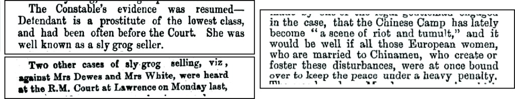 It’s undoubtedly true that some women on the goldfields were sex-workers. Papers of the time are full of magistrates notices of women being charged with prostitution. But aside from this we know little of their lives. Like most of the men on the goldfields, the women generally had lower-class backgrounds. This means they were more than likely to be illiterate and unable to tell their own stories… and so we are much more likely to hear about their perceived misdemeanours and ‘unseemly’ behaviour than their everyday lives. The newspapers of the time upheld traditional nineteenth century values. Women breaking out of the traditional mould, like those who chose sex-work as a way of making an independent living, those who freely associated with the Chinese, or those who sold ‘sly grog’ (liquor without a licence), were not treated kindly in the press. Some of these women, and their ‘bad’ characters, were mythologised in derogatory place names – Drunkenwoman’s Gully near Poolburn for example.