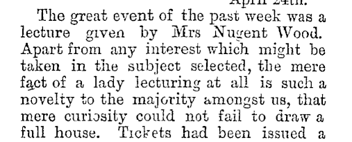 Even the ‘respectable’ middle-upper class married women on the goldfields rarely had a voice in society. A rare exception to this is Susan Nugent Wood, the wife of a goldfields warden in Otago in the 1860s. In her writings we find stories of women left behind at diggings while their husbands go to try new claims, having to fight off the attentions of other men, or women marrying miners of poor character being betrayed and beaten by their men (these both in Waiting for the Mail). Her stories and essays show how worried she was about the women off ill-character on the goldfields, and she is constantly demanding that women to uphold the virtues of modesty, grace and domesticity even on the goldfields. Somewhat ironically, Mrs. Wood was herself considered slightly scandalous as a woman on the goldfields who had a clear public voice – she even dared to give lectures about her work, much to the astonishment of local papers at the time!